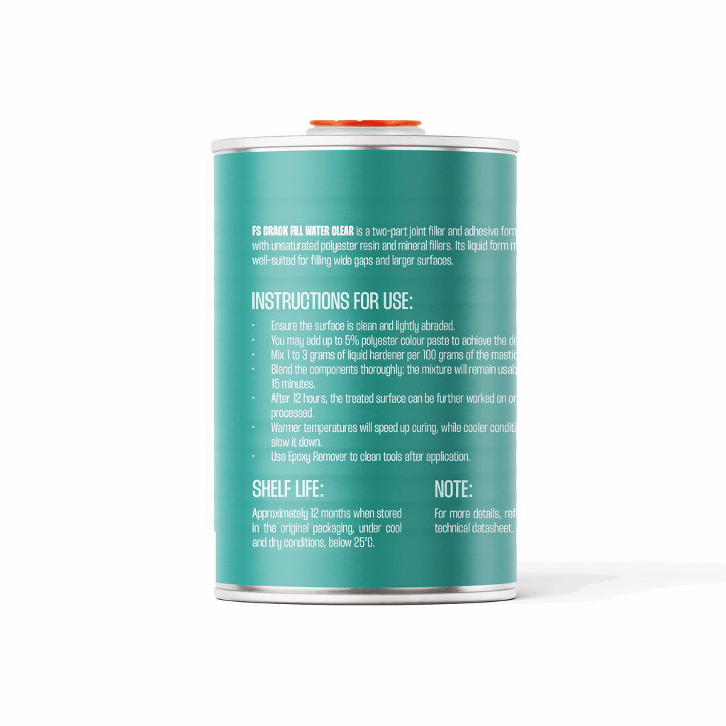 FS CRACK FILL WATERCLEAR is a two-part joint filler and adhesive formulated with unsaturated polyester resin and mineral fillers. Its liquid form makes it well-suited for filling wide gaps and larger surfaces.