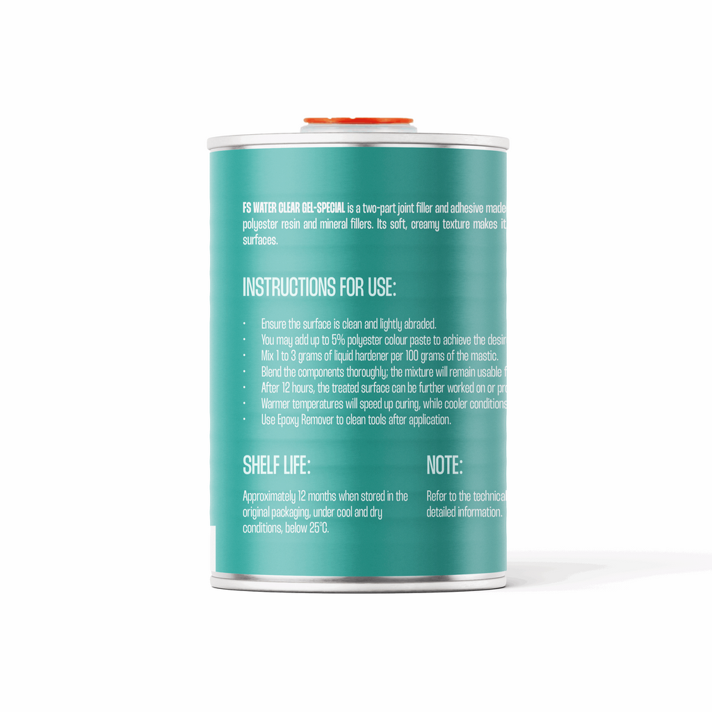 FS WATERCLEAR GEL-SPECIAL is a two-part joint filler and adhesive made from unsaturated polyester resin and mineral fillers. Its soft, creamy texture makes it ideal for use on vertical surfaces. Suitable for granite, marble, and other stone types, it can be tinted with up to 5% polyester colour paste for seamless blending. Optimized for use as a knife-grade stone filler, clear polyester adhesive, vertical stone crack filler, and natural stone joint sealer, it delivers strong, professional results in stone repair and bonding.